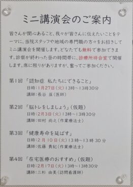 地域の皆さまに向けて、健康や暮らしに役立つ情報をお届けする「ミニ講演会」を開催いたします。関心の高いテーマを取り上げ、当院スタッフや地域の専門職がわかりやすくお話しします。診察後の昼休み時間に、診療所待合室で実施いたしますので、お気軽にご参加ください(参加無料・予約不要)。